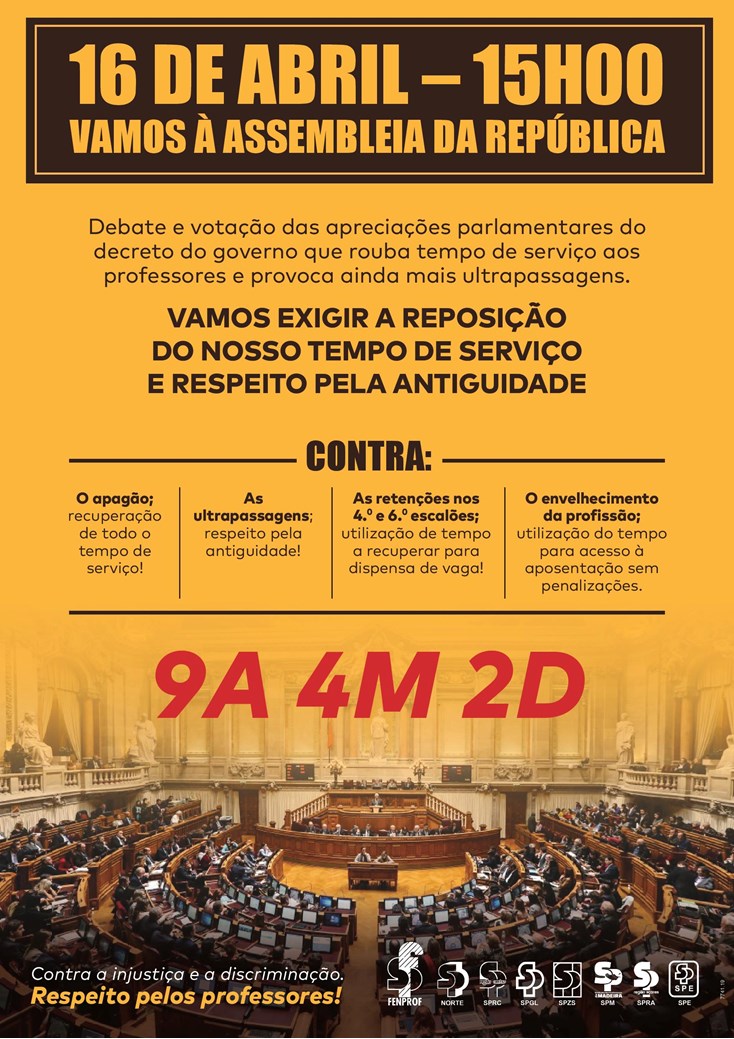 Dia 16 de abril, os docentes dirão, novamente «presente», à porta da AR, para o que haverá, como habitualmente, transportes assegurados pelos Sindicatos da Fenprof.