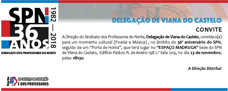 No âmbito do 36.º aniversário do SPN, a Delegação de Viana do Castelo promove a Exposição «Um ano de luta na Educação» que decorrerá entre 5 e 30 de novembro de 2018, no Espaço Madruga (Sede de Viana do Cstelo)