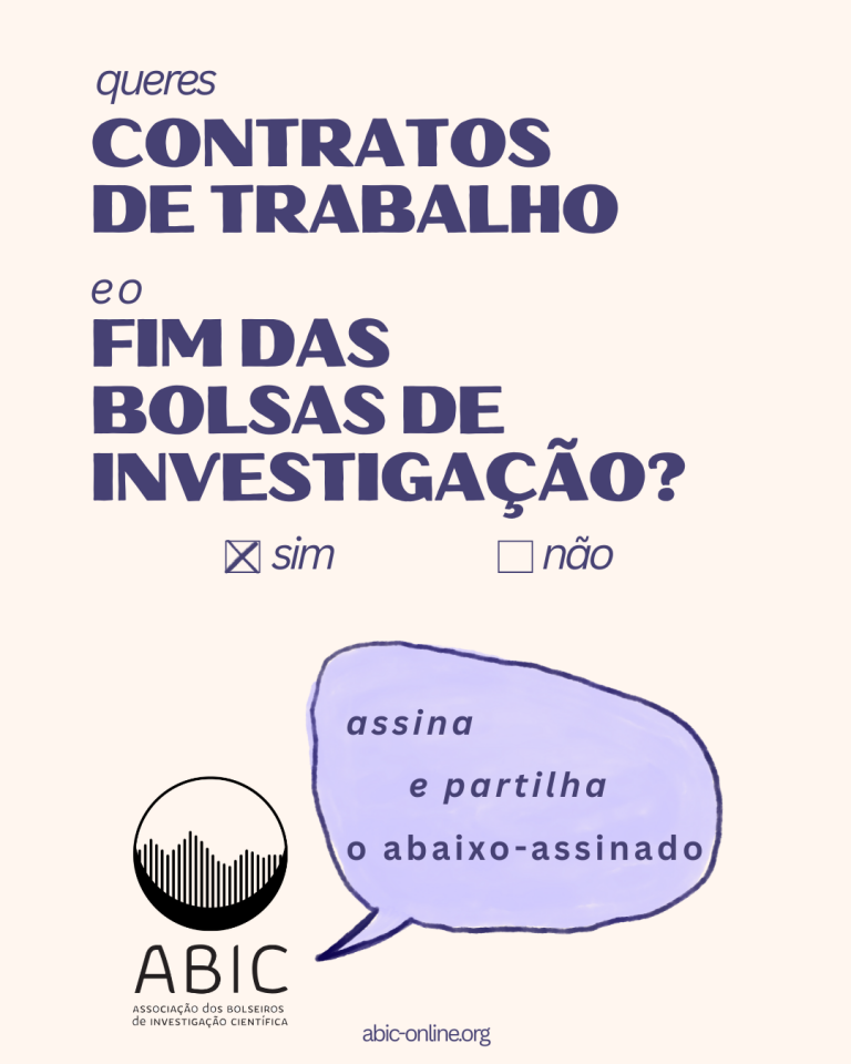 A Fenprof associa-se à Associação dos Bolseiros de Investigação Científica (ABIC) na concentração em frente ao Ministério da Educação, Ciência e Inovação (MECI), no dia 23 de abril (14h). Em causa está a revogação do Estatuto de Bolseiro de Investigação (EBI) e aplicação imediata do Estatuto da Carreira de Investigação Científica (ECIC), bem como de exigência de um futuro digno para quem faz investigação.