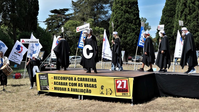 Perante uma plateia constituía por educadores, professores e alguns bonecos, ao longo da manhã desfilaram no palco vários docentes que deram conta da sua situação profissional e testemunharam que ao fim de tantos anos de serviço se encontram, uns com a carreira congelada, outros com a carreira aldrabada, e outros tantos com a carreira roubada, encravada ou injustiçada. Ora, todos estes (e outros) problemas que estão por resolver derivam de um problema maior: o bloqueio negocial. Um bloqueio imposto pelo governo e pelo ME.