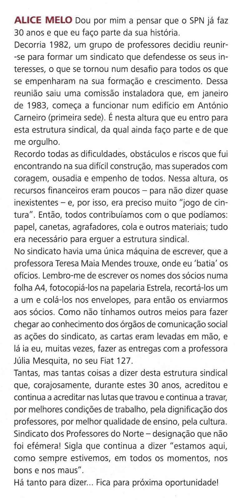 É com grande pesar e consternação que tomámos conhecimento da morte da Alice Melo, a primeira funcionária do Sindicato dos Professores do Norte. Aqui exerceu funções desde a fundação do SPN até ao final do ano de 2017, trabalhando com sucessivas direções, de forma diligente e empenhada.