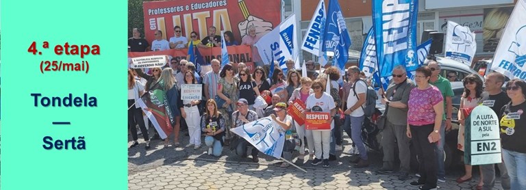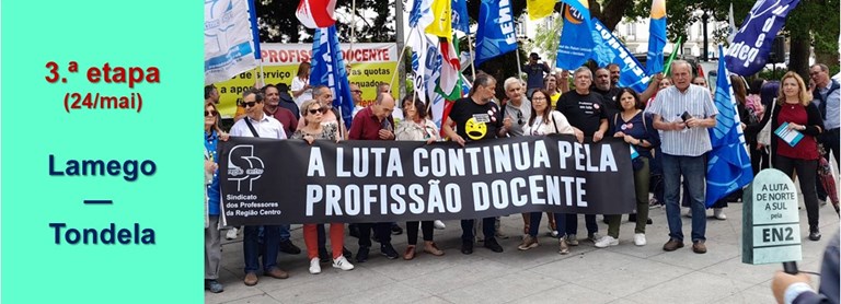 A luta continua, desta vez atravessando o país de norte a sul, pela Estrada Nacional n.º 2 (EN2) que será palco da próxima iniciativa que as organizações sindicais irão realizar. Com saída de Chaves (22/mai) e chegada a Faro (30/mai), a caravana terá sete etapas plenas de contactos com a população, concentrações e plenários de educadores e professores, entre outras atividades. De carro, de moto ou de bicicleta, o grande painel móvel (ver cartaz), será acompanhado por muitos docentes.