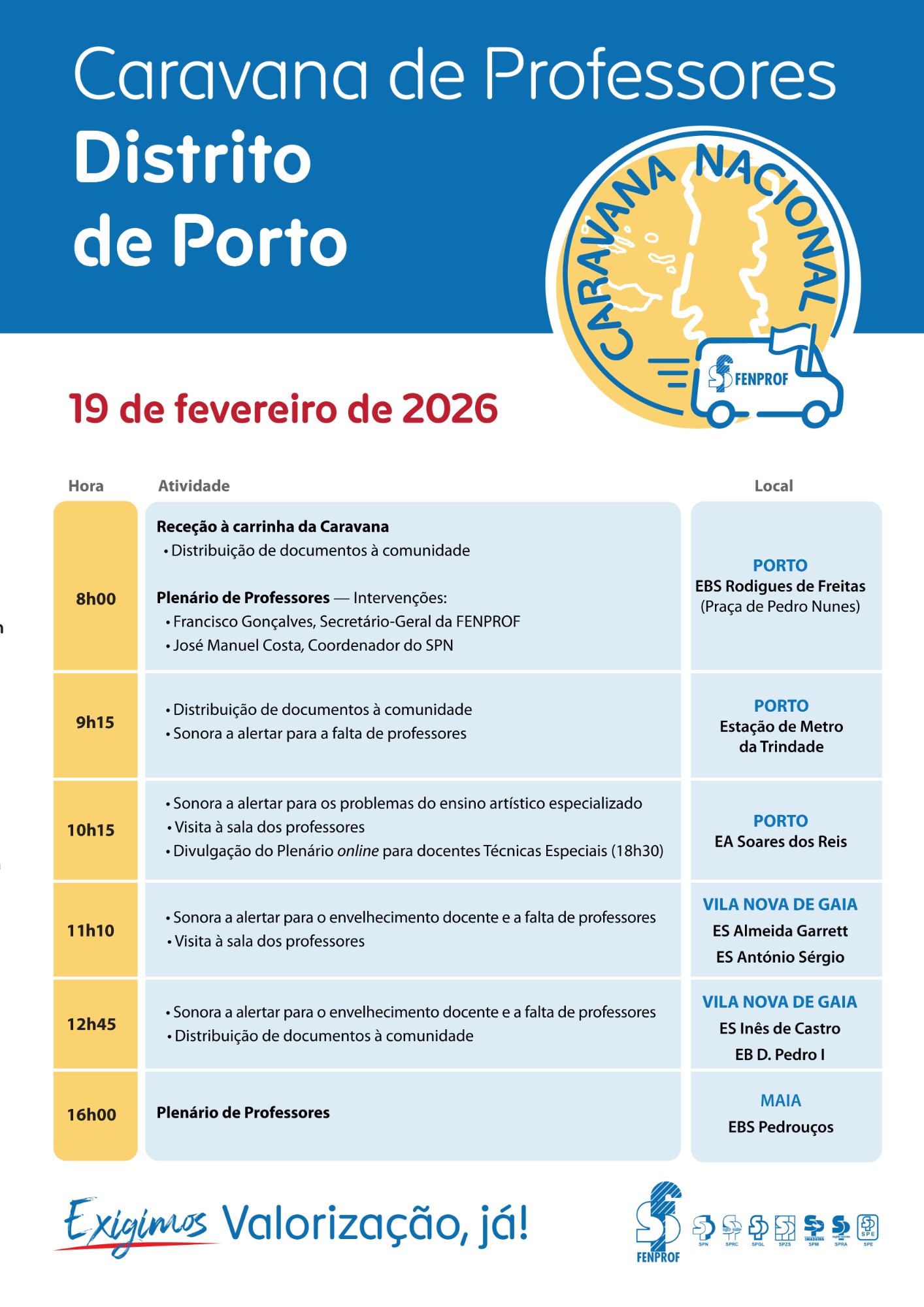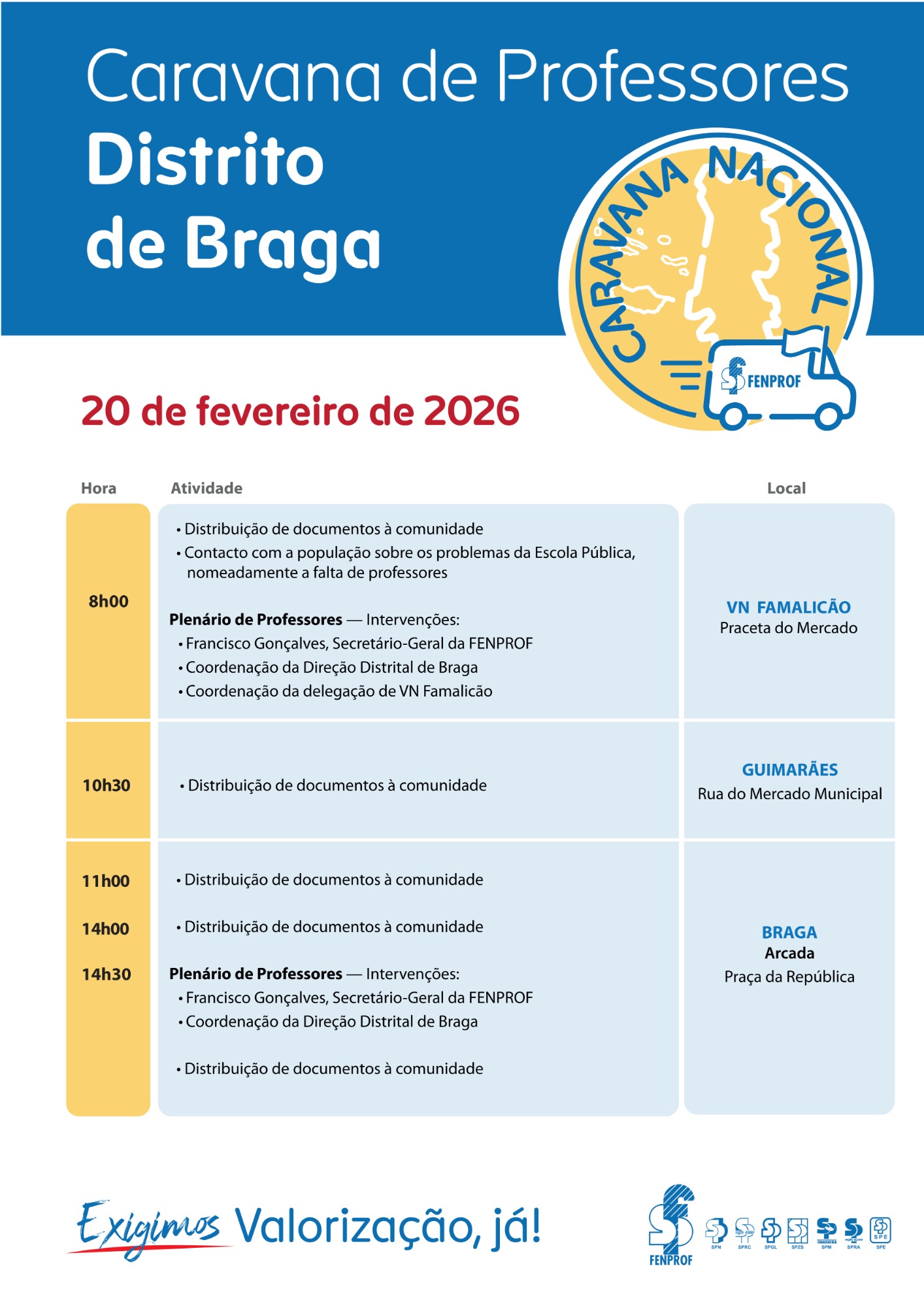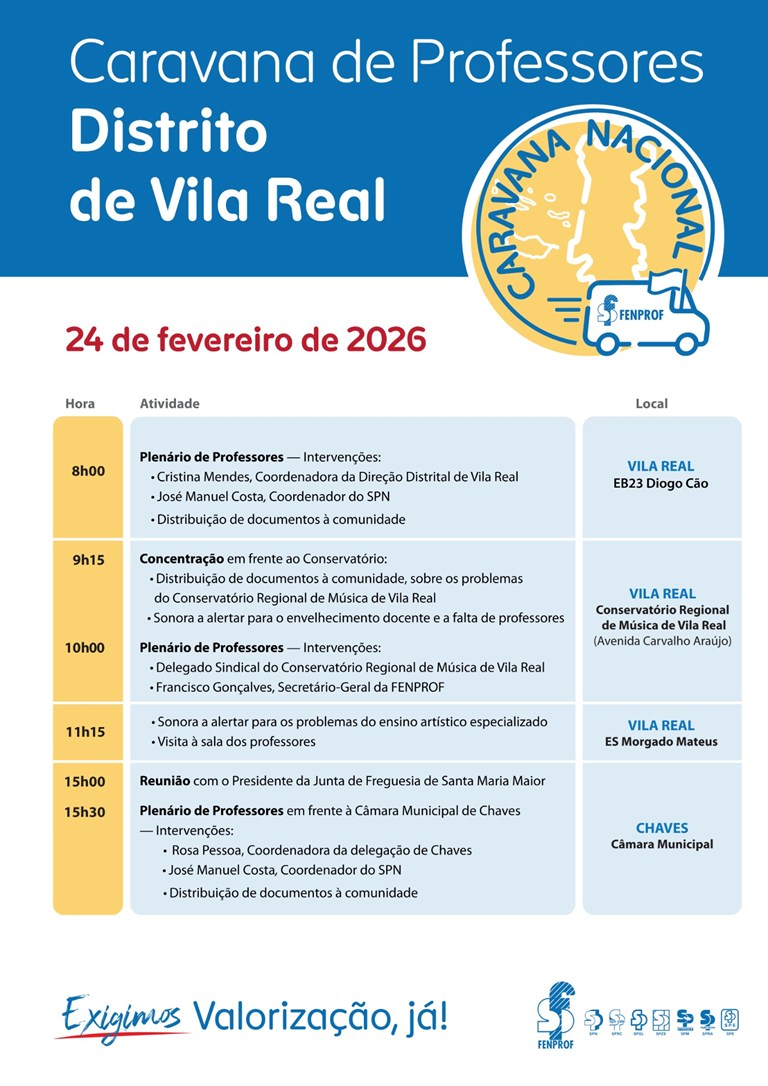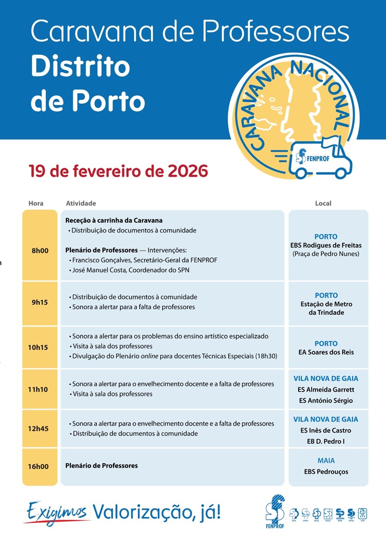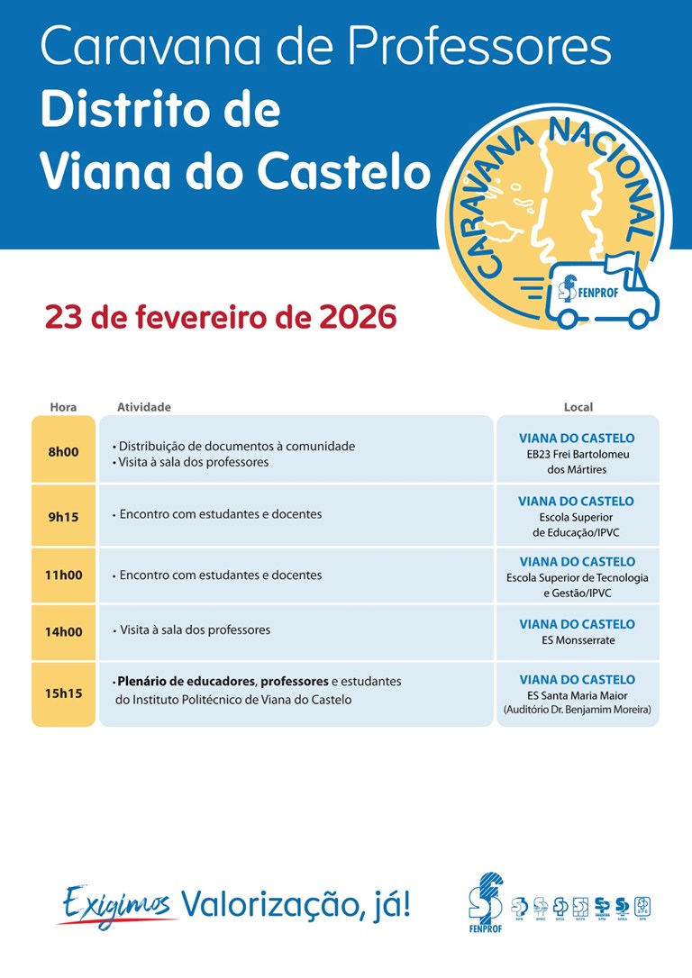 A Fenprof vai promover uma conferência de imprensa para divulgar uma Caravana Nacional — “Somos Professores. Damos rosto ao futuro! Valorização, já!” — que percorrerá o país (regiões autónomas incluídas) entre 19/fev e 4/mar e disso dará conta em conferência de imprensa.