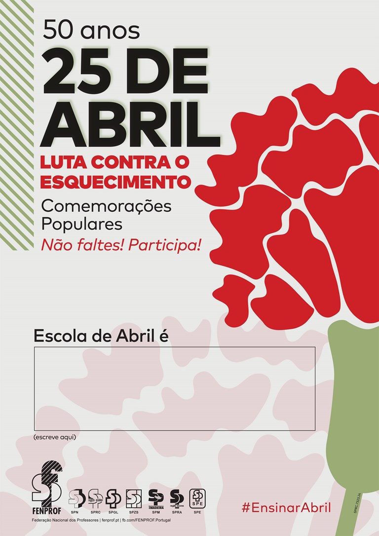 Numa iniciativa da Fenprof, que vai decorrer durante o ano de 2024, os educadores e os professores são desafiados a, junto das crianças e dos alunos, a completar este cartaz com uma única palavra que adjetive, com dignidade, a Escola que Abril ajudou a cumprir. Em alternativa, podem os mesmos criar um cartaz alusivo ao 25 de Abril