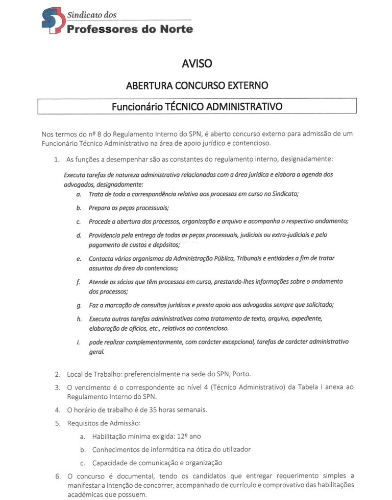 Aviso de abertura do Concurso Externo para admissão de um funcionário técnico administrativo de apoio na área Jurídica (Porto)