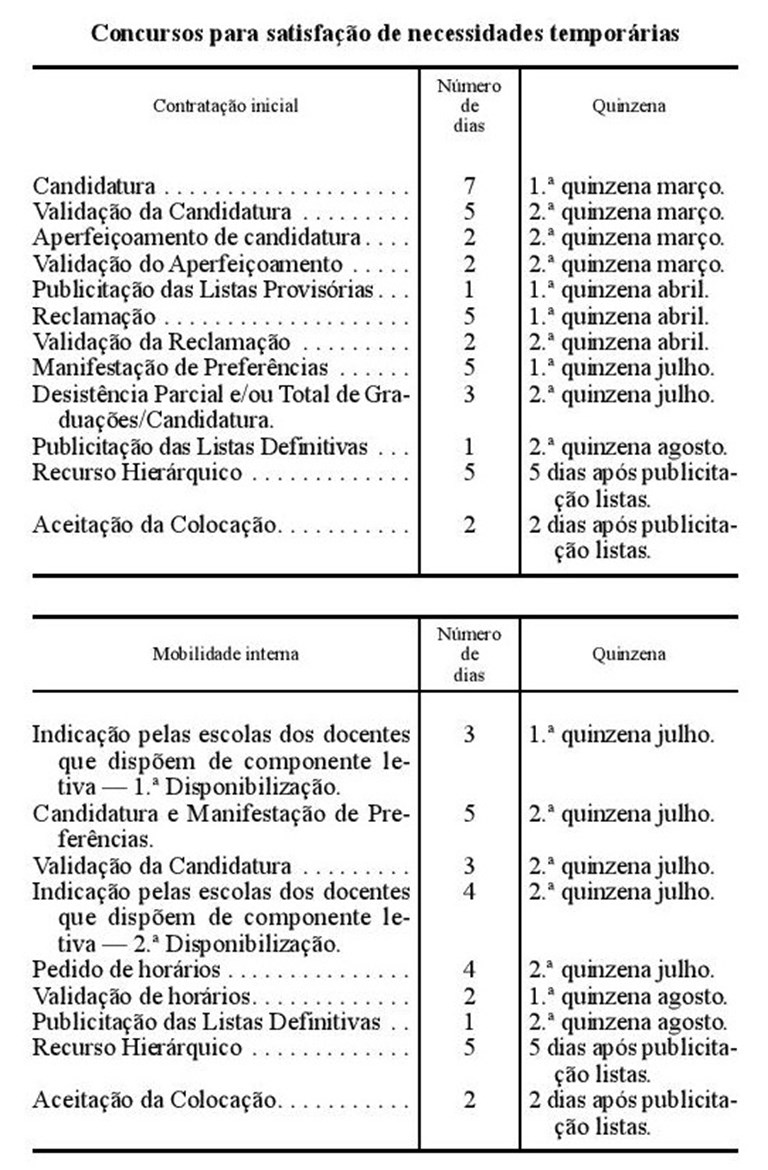 Quanto à candidatura ao concurso de mobilidade interna e à fase de expressão de preferências dos concursos de contratação inicial e reserva de recrutamento, elas terão lugar em datas a divulgar posteriormente, em ambos os casos pelo período de 5 dias úteis, com previsão para o mês de Julho, sendo que antes terá ainda lugar a publicitação das listas definitivas relativas ao concurso externo, prevista para a 1.ª quinzena de Junho.