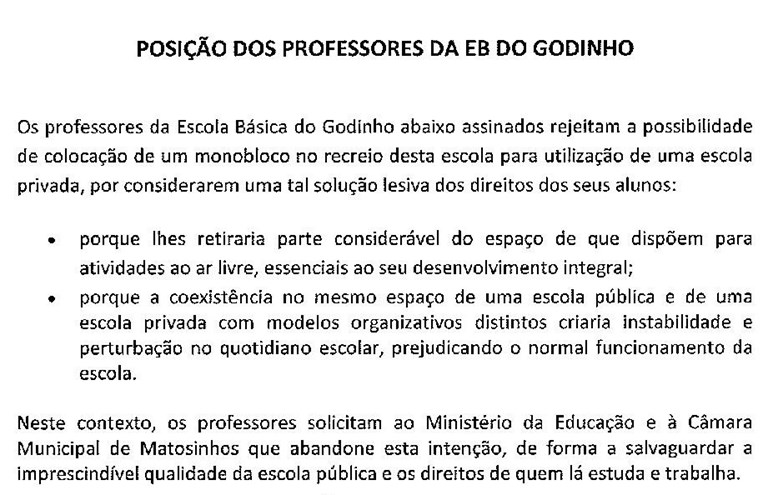 No dia 5 de outubro – Dia Mundial dos Professores –, pais, encarregados de educação e alunos da Escola Básica do Godinho organizaram uma ação de protesto contra a colocação de um monobloco no espaço de recreio da Escola, reagindo, assim, à decisão da Câmara Municipal de Matosinhos de ceder 90 m2 do espaço de recreio para o funcionamento da escola privada SCHOLÉ, conseguindo, desta forma, impedir a colocação do referido monobloco. Esta ação provou, mais uma vez, que só é vencido quem desiste de lutar.