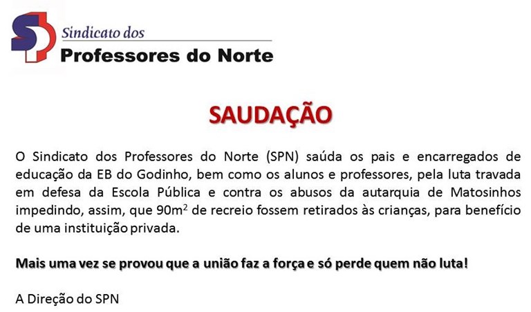 Sabendo que os professores da escola estão solidários com a ação que os pais desenvolveram e estiveram presentes nessa contestação, a Direção do SPN associou-se a essa iniciativa, numa expressão de solidariedade e apoio à comunidade escolar de uma escola pública que se vê invadida por uma escola privada, por decisão arbitrária da autarquia.