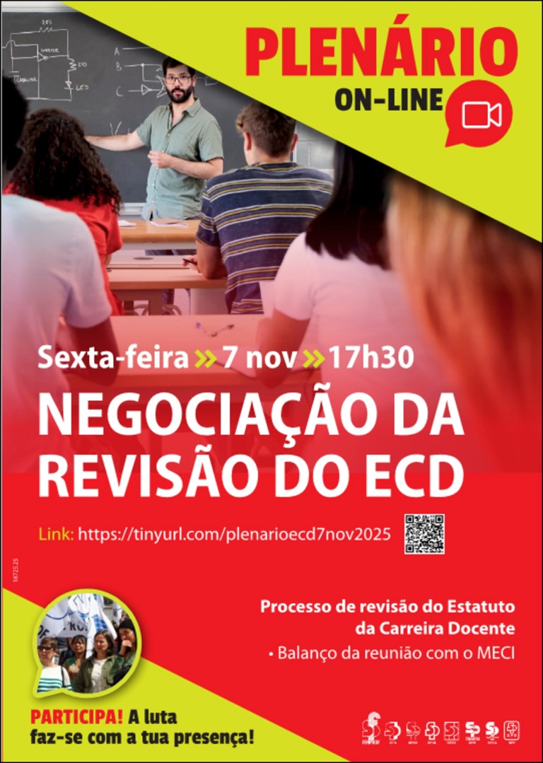 Tal como prometido, sempre que houver uma reunião de negociação com o MECI sobre a revisão do ECD, a Fenprof realizará um plenário de educadores e professores, online, aberto a todos os docentes, com o objetivo de dar a conhecer os desenvolvimentos do processo negocial, as propostas, as contrapropostas e as ações de luta.