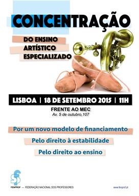 Os professores das escolas de ensino artístico, com o apoio da FENPROF, não irão ficar calados a assistir à extinção de uma tão importante resposta educativa e, no próximo dia 18, irão manifestar-se junto às instalações do MEC na Avenida 5 de Outubro. Entretanto, dia 16 de setembro (próxima quarta-feira), pelas 16 horas, terá lugar uma Conferência de Imprensa, em Lisboa (em local ainda a divulgar), na qual serão divulgados dados concretos da situação que está a ser vivida, sendo também tornado público o formato da iniciativa prevista para dia 18.