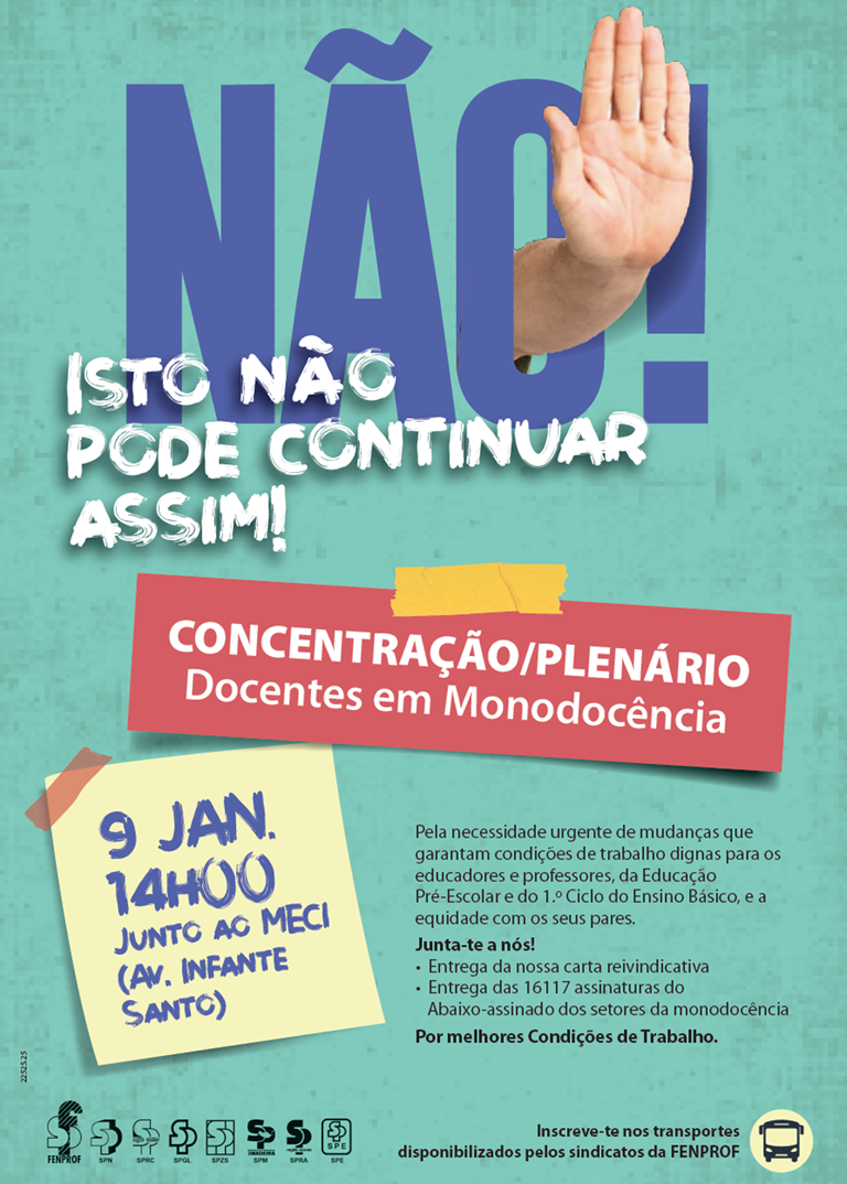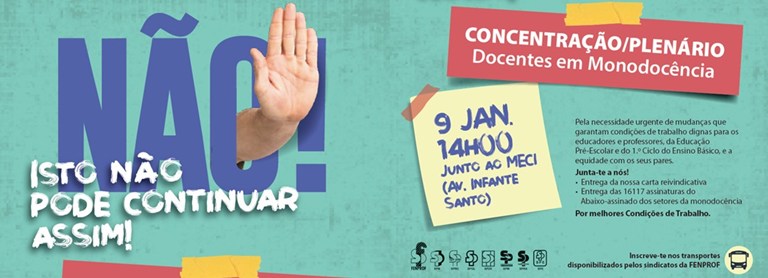 A Fenprof vai organizar uma concentração/plenário de docentes em monodocência, no dia 9 de janeiro, junto ao Ministério da Educação, Ciência e Inovação (MECI). Durante a iniciativa a uma delegação da Federação fará a entrega das 16 117 assinaturas recolhidas no abaixo-assinado “Por melhores condições de trabalho”, que, no essencial exigia a necessidade urgente de mudanças que garantam condições de trabalho dignas para os educadores de infância e professores do 1.º ciclo do ensino básico e a equidade com os seus pares.