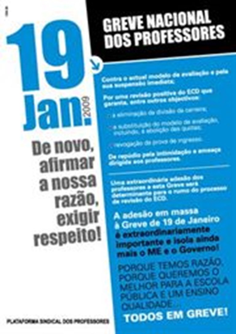 Os professores e educadores portugueses estão a fazer uma grande greve, hoje, dia 19 de Janeiro, data, em que se completam dois anos sobre a publicação do Estatuto da Carreira Docente. Os milhares de professores e educadores em paralisação , em todo o País, exigem: