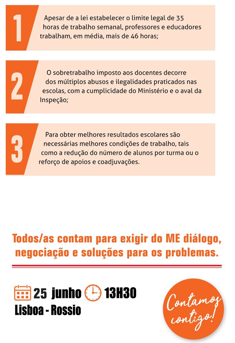 Com esta iniciativa, que constitui mais um ato de protesto contra o bloqueio negocial que, há longo tempo, vem sendo imposto pelo Ministério da Educação (ME), pretende-se dar destaque às consequências muito negativas para os educadores e professores, profissionais que, tal como outros, se distinguem pelo profissionalismo e pela entrega à profissão e aos alunos. Essa entrega e esse profissionalismo têm estado, uma vez mais, presentes nestes tempos de pandemia, quer exercendo a sua atividade em regime presencial ou a distância. Contudo, apesar do zeloso cumprimento dos seus deveres, os docentes continuam sem ver respeitados direitos mais elementares, como o direito a uma carreira valorizada e nos termos legalmente estabelecidos, a estabilidade, a uma aposentação digna e num tempo que tenha em consideração o desgaste físico e psicológico a que estão sujeitos, respeitando, ainda, a necessidade de rejuvenescimento do corpo docente das escolas.