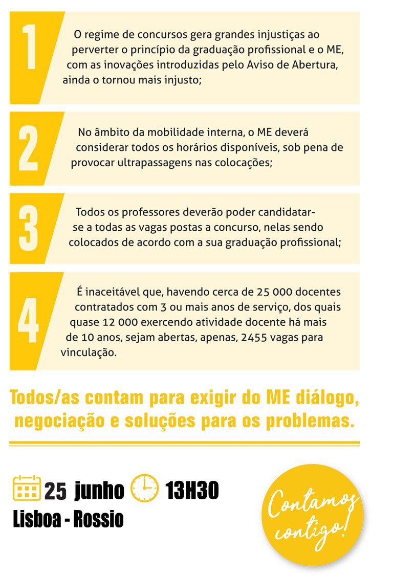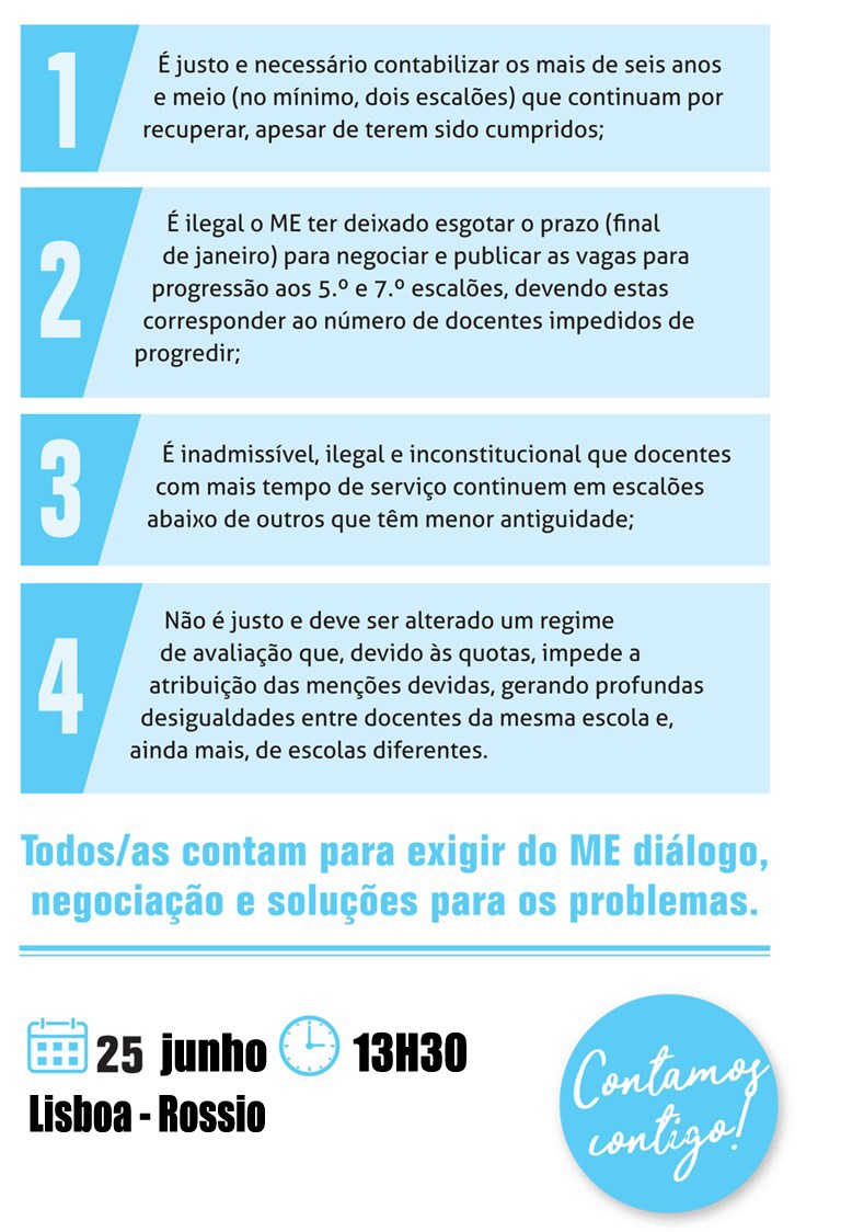 A Fenprof protestou, no Rossio, dia 25 de junho, com uma "Feira dos problemas com soluções bloqueadas", onde participaram várias dezenas de educadores e professores. Em causa esteve a denúncia do bloqueio negocial imposto pelo Ministério da Educação (ME) que, há quatro anos, impede a resolução de problemas, como a precariedade, a melhoria das condições de trabalho dos docentes, a recuperação do tempo de serviço congelado e a recomposição da carreira, o rejuvenescimento da profissão e a criação de um regime específico de aposentação.