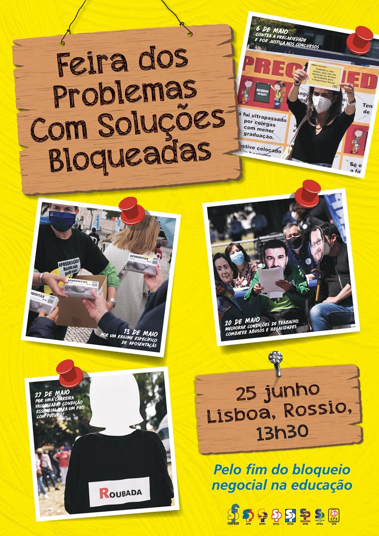 Como a Fenprof não desiste de lutar, vai, agora, realizar a "Feira dos Problemas com Soluções Bloqueadas", no dia 25 de junho. O local será uma grande praça de Lisboa (Pç. Rossio) e terá como objetivo alertar a população para o atual bloqueio negocial em que vivem os docentes, assim como dar a conhecer os grandes problemas do setor. A Feira terá início pelas 13h30m.