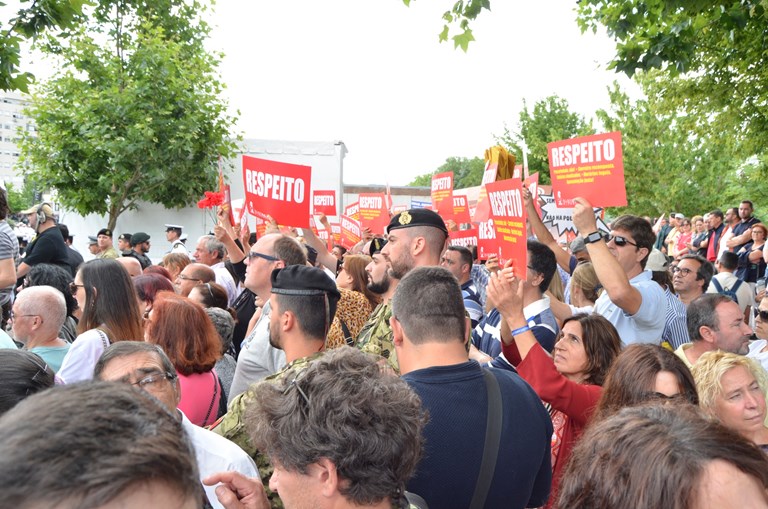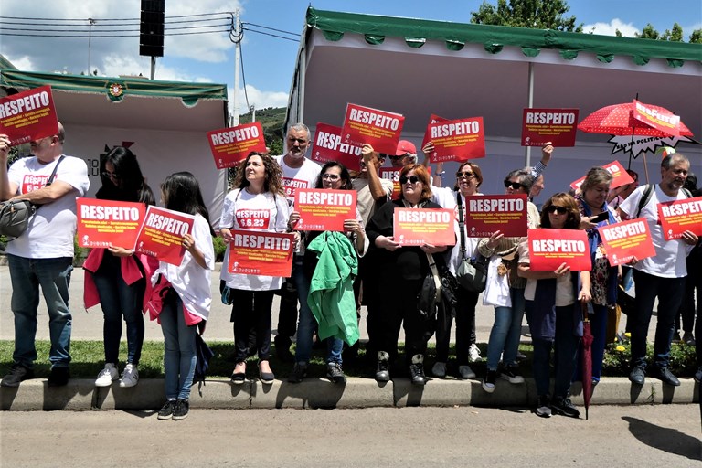 Os educadores e os professores presentes exibiram cartazes exigindo "Respeito" e t-shirts em que constava uma referência aos 6A 6M 23D de trabalho que faltam recuperar. Respeito: