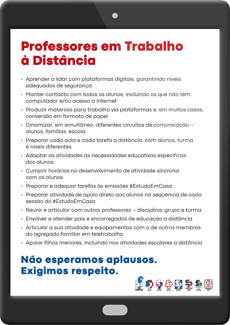 A Fenprof referiu, ainda, o alheamento da tutela em relação às condições dos docentes para o teletrabalho e propôs aos partidos políticos que aprovassem a possibilidade de serem consideradas, em sede de IRS, as despesas que estes fizeram para poderem dar as respostas que lhes foram exigidas, como, por exemplo, em equipamentos informáticos.