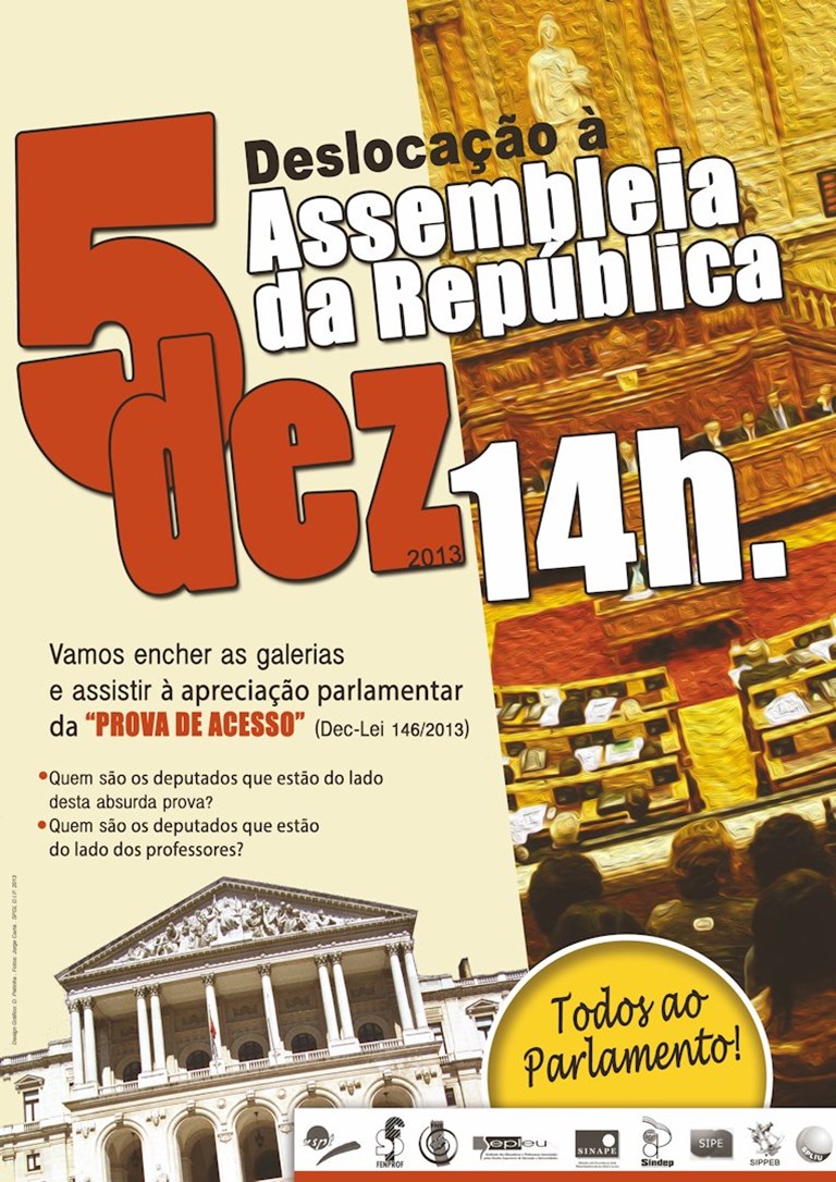 - Apela-se aos professores – contratados, desempregados ou dos quadros – para uma Deslocação à Assembleia da República, dia 5 de dezembro, pelas 14.30 horas, para que assistam à apreciação parlamentar sobre a “prova de ingresso” agendada para esse dia. Seguir-se-á uma Concentração de Professores frente ao Parlamento. Apela-se aos Professores que se apresentem de roupa negra, reforçando dessa forma o seu protesto;