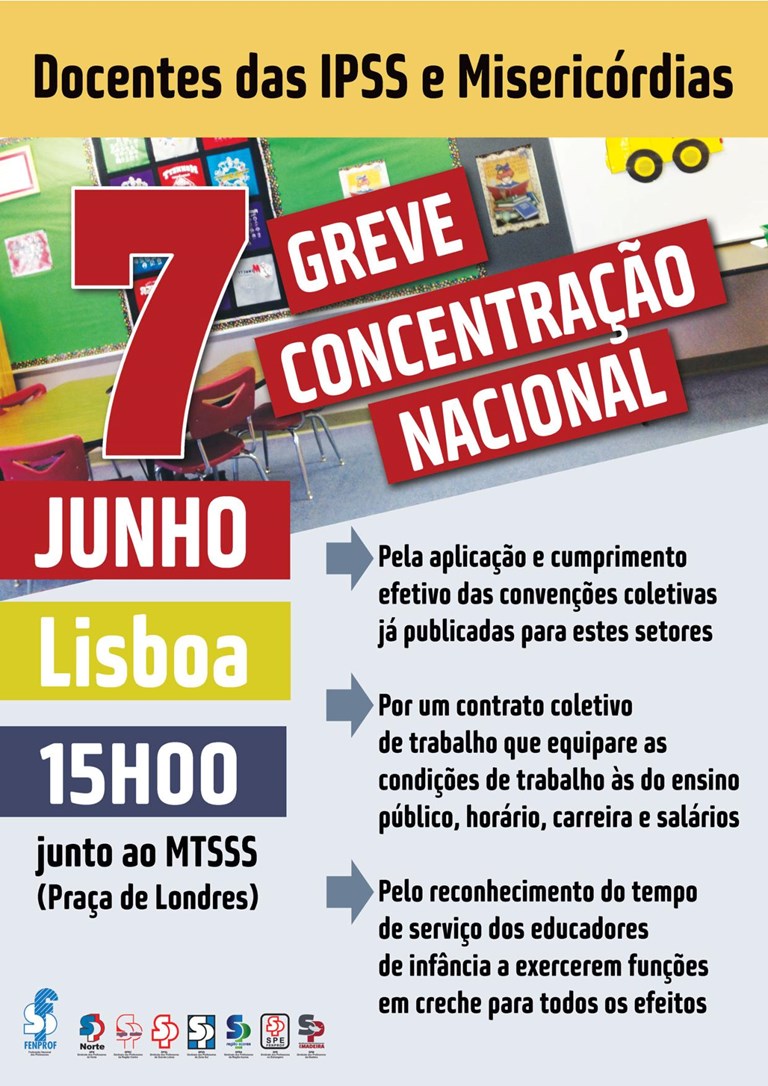 Perante esta situação, a Fenprof, em conjunto com a Federação Nacional dos Sindicatos dos Trabalhadores em Funções Públicas e Sociais e outros Sindicatos decidiram fazer do dia 7 de junho um dia de luta para todos trabalhadores das IPSS e Misericórdias convocando uma greve e Concentração Nacional para esse dia, às 15h00 junto ao MTSSS na Praça de Londres, em Lisboa (consulte aqui o cartaz).