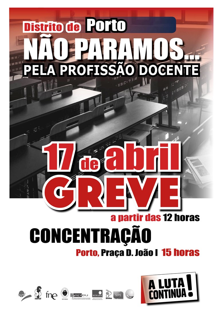Os educadores e os professores iniciaram, no dia 17 de abril, mais uma ronda de greves por distritos que irá percorrer o país até 12 de maio. O início da greve no distrito do Porto foi assinalado ao meio-dia à porta da Escola Básica e Secundária de Canelas, em Vila Nova de Gaia, com a presença de dirigentes das nove estruturas sindicais dos docentes. À tarde, os professores e educadores do distrito do Porto concentrar-se-ão na Praça D. João I, no Porto.