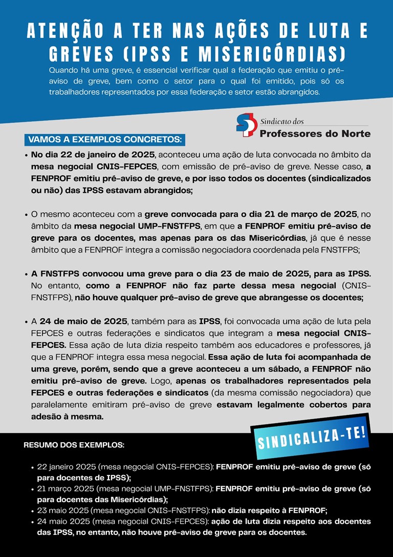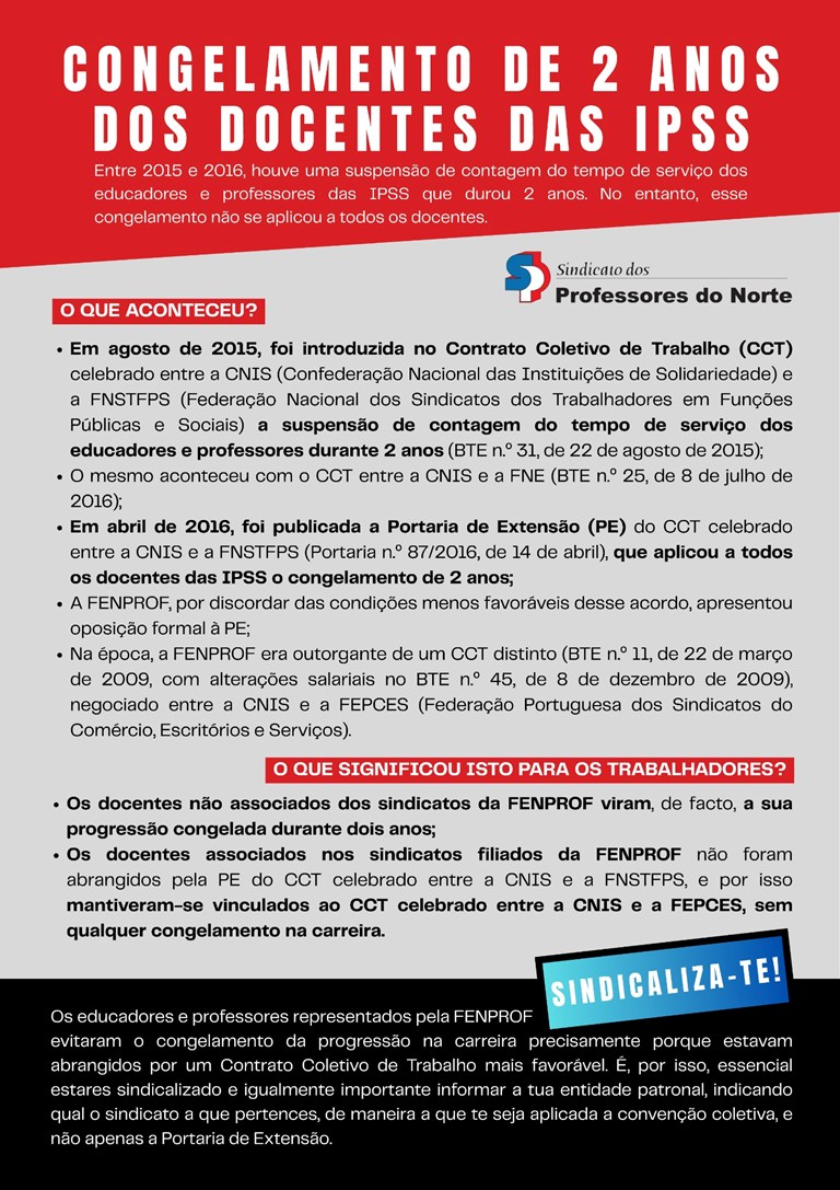 O Sindicato dos Professores do Norte (SPN) preparou um conjunto de cartazes informativos para esclarecer os educadores e professores das Instituições Particulares de Solidariedade Social (IPSS) sobre temas centrais da sua carreira profissional e que abordam questões fundamentais como o congelamento do tempo de serviço, a complexidade das mesas negociais e o impacto real da sindicalização nos salários e direitos dos trabalhadores. Através de exemplos concretos, os cartazes mostram como a ação sindical pode fazer a diferença no quotidiano profissional e reforçam a importância de estar representado por um sindicato que defenda verdadeiramente os interesses da classe docente.