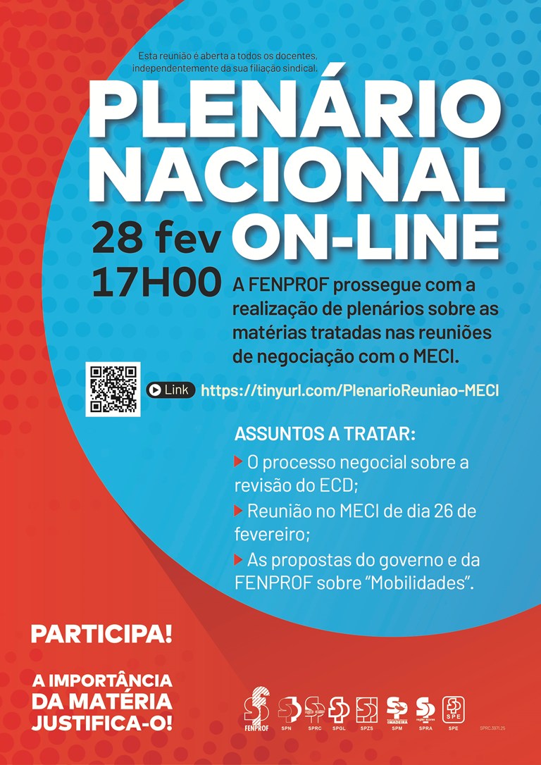Neste plenário serão dadas informações da reunião negocial havida no 26 de fevereiro, sobre as mobilidades, incluindo a mobilidade por doença, assim como serão abordadas as propostas da Fenprof para a revisão do ECD e o debate em curso com os educadores e professores, que serão aprovadas no Plenário Nacional de 7 de março, no ISCTE (Lisboa).
