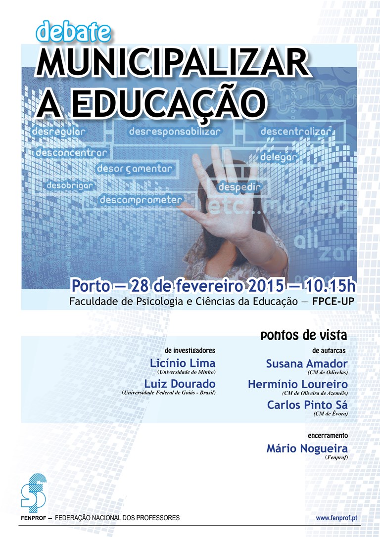 A FENPROF realiza, no próximo dia 28 de fevereiro, no Porto, um debate sobre a municipalização da educação que contará com a presença de um prestigiado investigador da Universidade de Goiás, Luiz Dourado, membro do Conselho Nacional de Educação do Brasil, e do reconhecido especialista em administração escolar da Universidade do Minho, Licínio Lima.