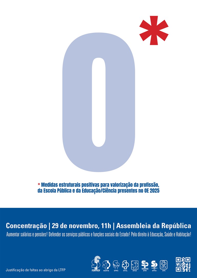 Por medidas estruturais positivas para valorizar a profissão, a Escola Pública e a Educação/Ciência presentes no OE/2025. Pelo aumento dos vencimentos e das pensões! Pela defesa dos serviços públicos e funções sociais do Estado! Pelo direito à Educação, Saúde e Habitação! Sexta-feira, 29 de novembro, pelas 11 horas. Em Lisboa.