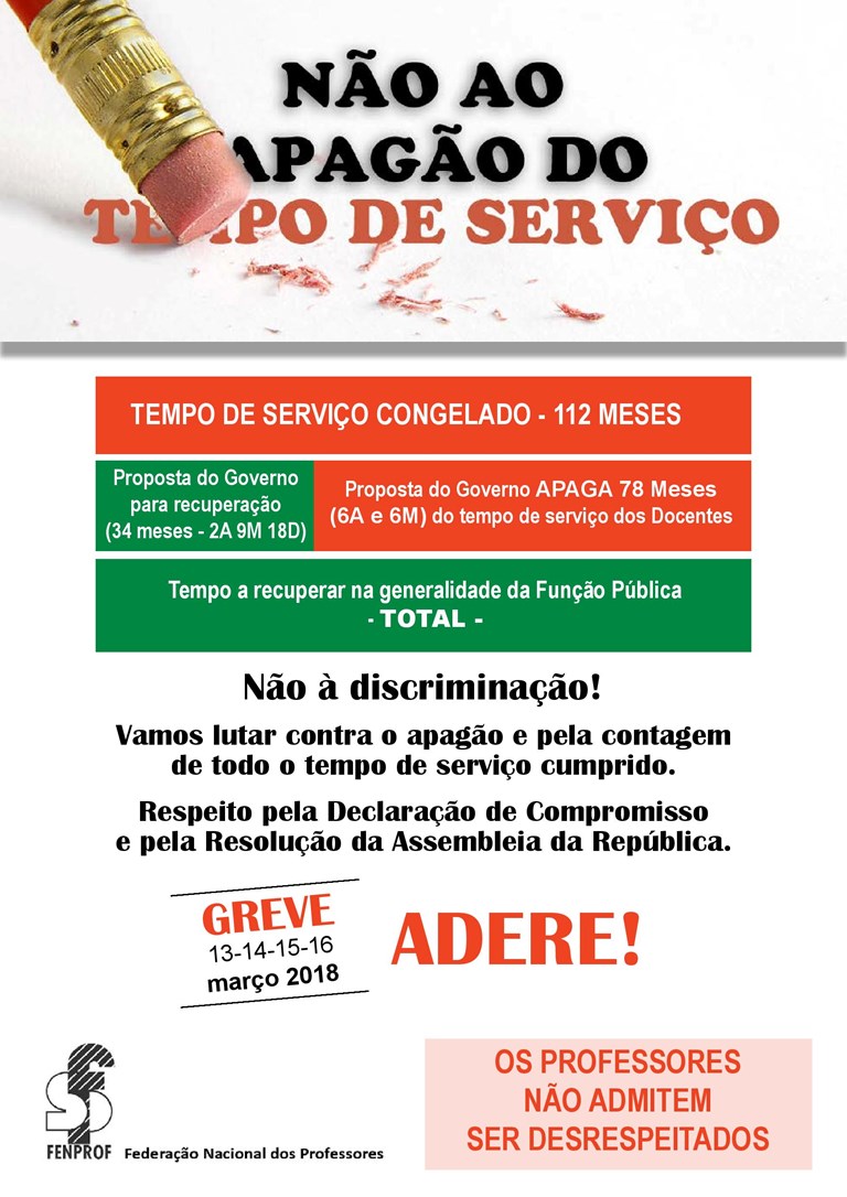 Os professores foram penalizados com cortes salariais e congelamento de tempo de serviço, como os demais trabalhadores da Administração Pública e não admitem que, no momento da recuperação desse tempo de serviço, não lhes seja dado tratamento semelhante ao de outros trabalhadores. Uma coisa será a disponibilidade para negociar a forma, os tempos e o ritmo da recuperação, outra será abrir mão de um dia de serviço cumprido… tal não acontecerá, nisso pode crer o governo, pois os professores não aceitam ser discriminados, como estão a ser!