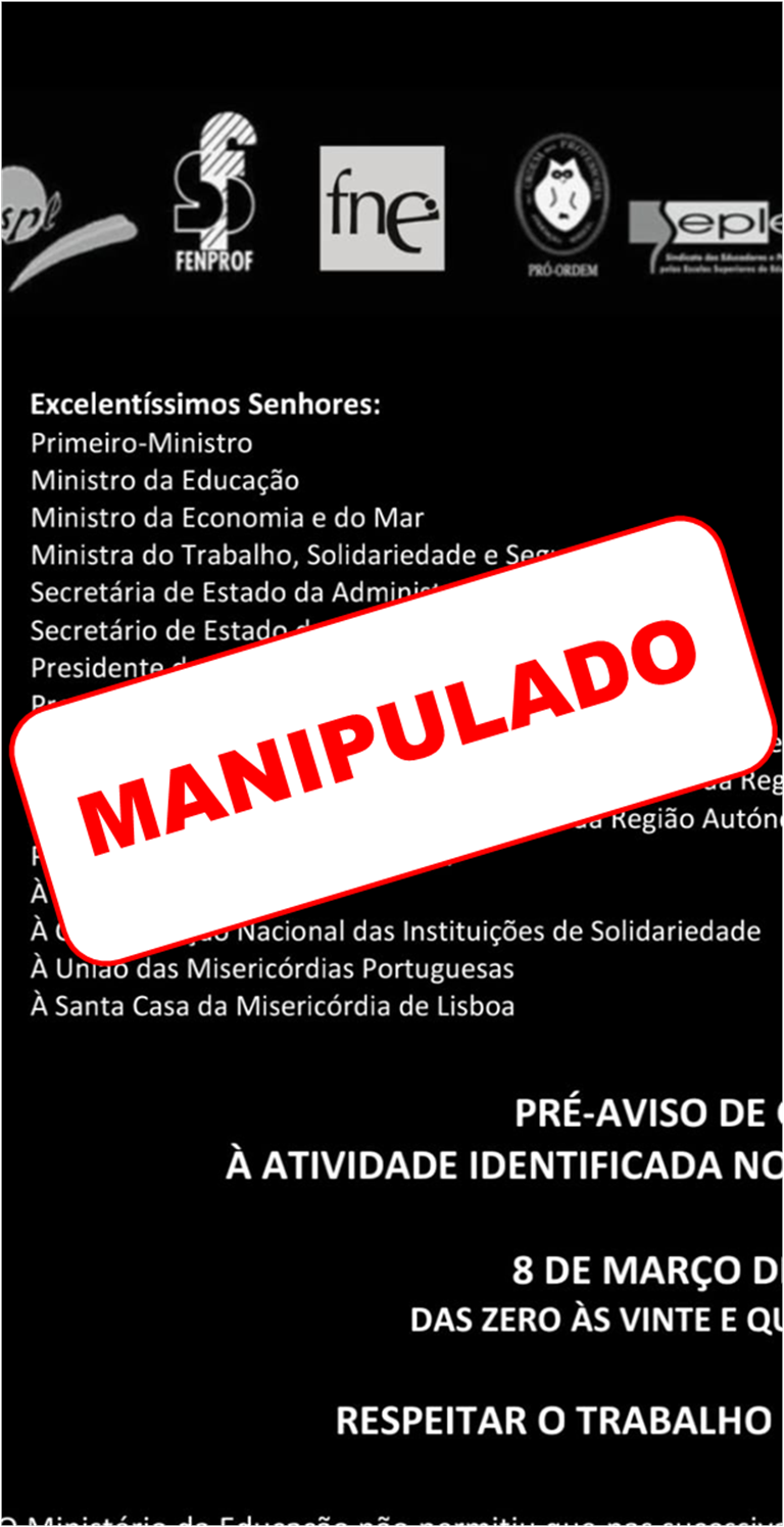 Esclarece-se que esta informação é falsa, tratando-se de uma manipulação de parte da imagem de um documento (o pré-aviso de greve à CNLE do dia 8 de março de 2024), cuja origem as organizações sindicais irão apurar.
