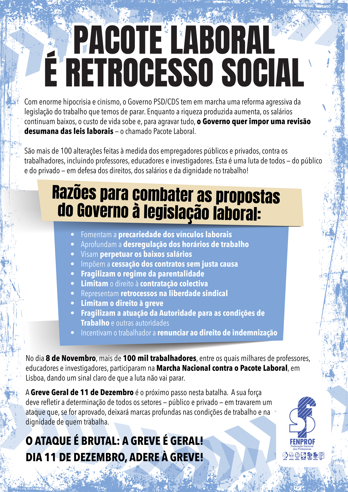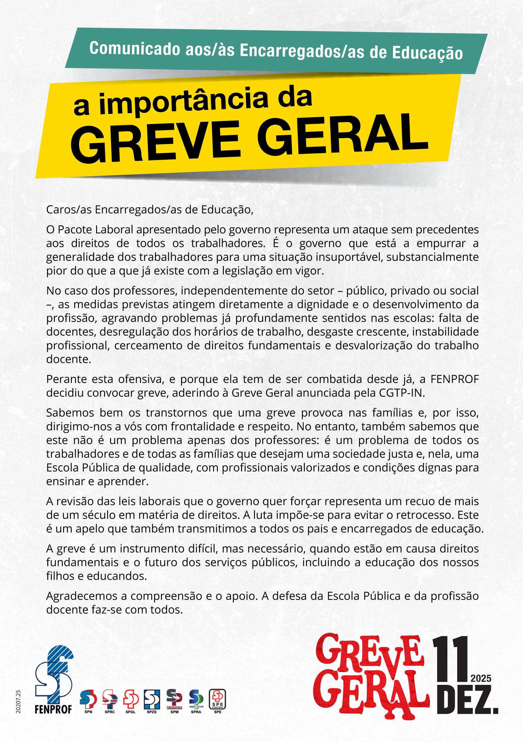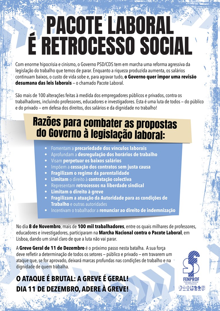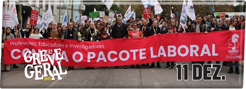 Na luta contra o pacote laboral ("Trabalho XXI") que o governo pretende impor, as centrais sindicais entenderam convocar greve geral para 11 de dezembro. Neste processo, os educadores, professores e investigadores saberão dar uma resposta firme, porque, é claro, não ficarão imunes às consequências de um pacote que pretende restringir direitos, fragilizar a contratação coletiva, facilitar o despedimento e aumentar a precariedade. A Fenprof apela à responsabilidade coletiva e individual, com uma adesão em massa à greve geral.