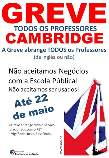 Prova escrita do exame Cambridge não se realizou em escolas de todo o país, ficando cerca de 6000 alunos sem a realizar. Foram muitos os professores que, em todo o país, fizeram greve ao serviço de vigilância à prova escrita do exame da Cambridge “Preliminary English Test (PET)”, juntando, dessa forma, o seu protesto ao dos colegas de Inglês que, em número crescente, têm vindo a aderir à greve às provas orais que se prolongarão até dia 22 de maio.