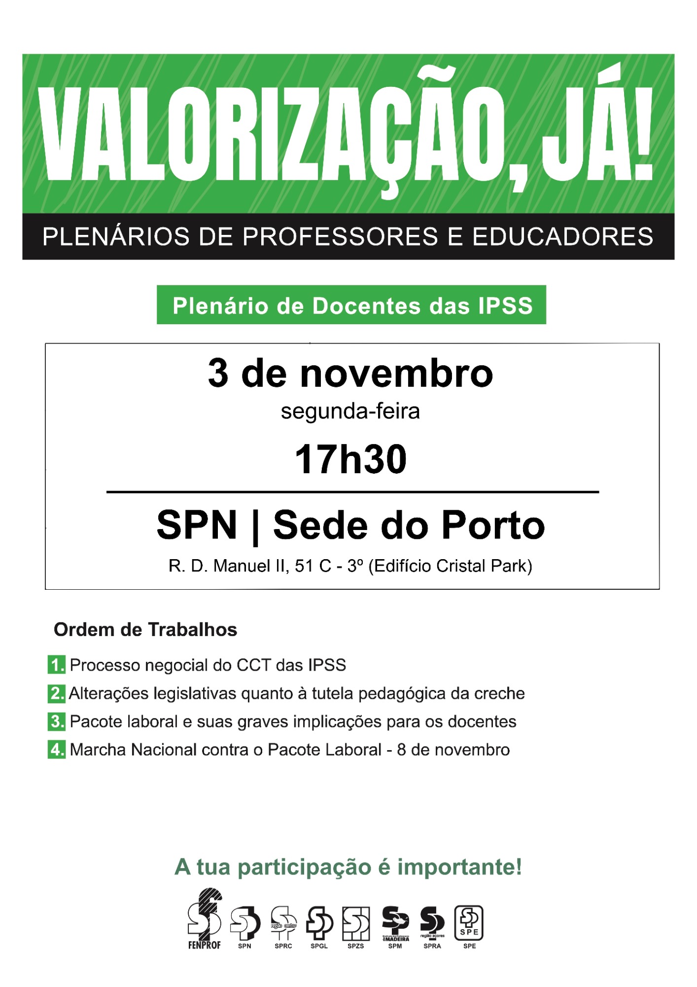 O SPN irá realizar um plenário destinado aos educadores e professores das Instituições Particulares de Solidariedade Social (IPSS), com o objetivo de discutir o processo de negociação com a Confederação Nacional das Instituições de Solidariedade (CNIS).