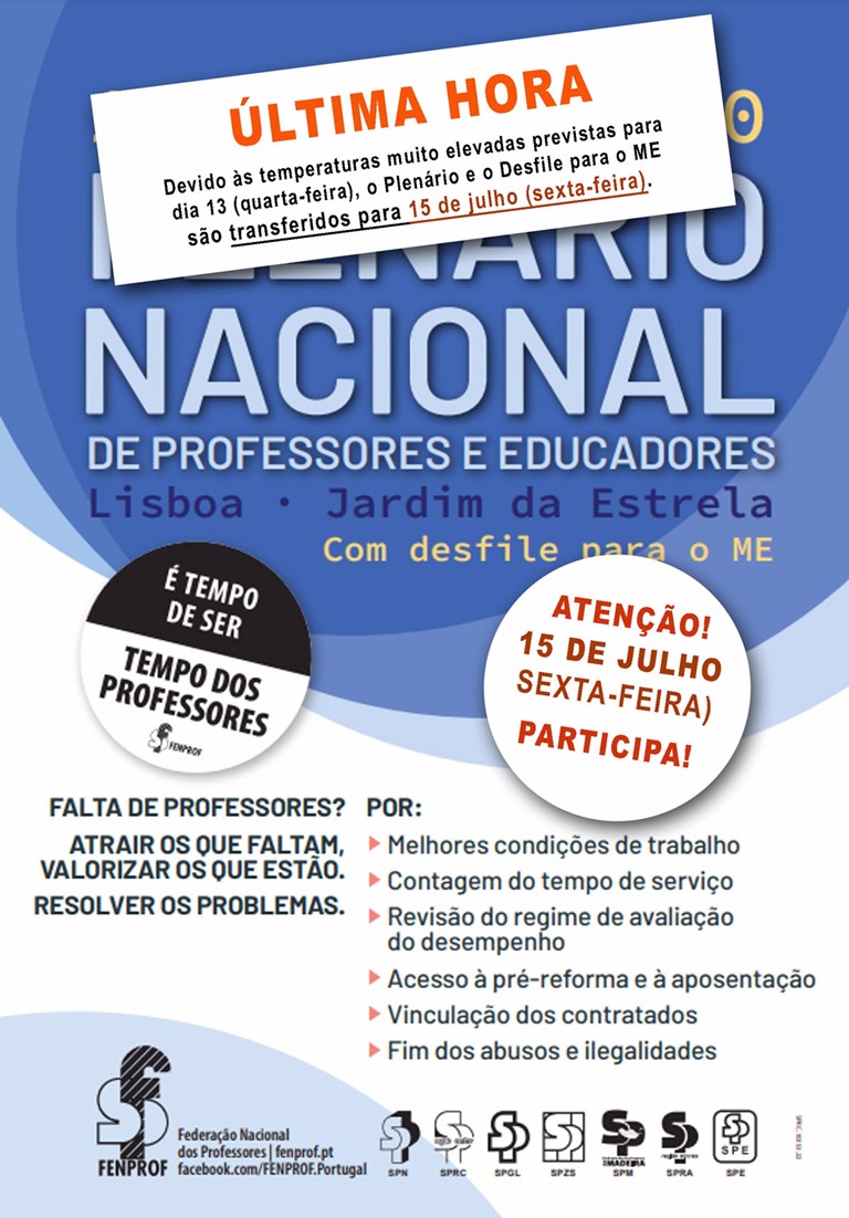 Plenário de Dia 15 de julho (sexta-feira), haverá um plenário nacional de educadores e professores, que se realizará no Jardim da Estrela (lugar aprazível), em Lisboa, que será, certamente, um sinal forte que os docentes darão ao ME/Governo, neste final de ano letivo, da sua disposição para lutarem pela valorização da profissão e da sua vida.
