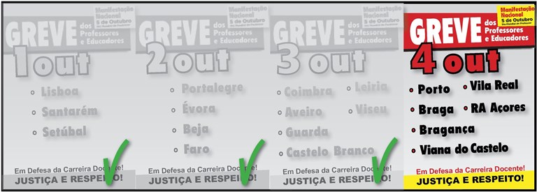 Com a greve que se inicia nos distritos de Lisboa, Santarém e Setúbal, estendendo-se às restantes regiões até dia 4, em 5 de outubro, com a Manifestação Nacional de Professores e Educadores e, nas semanas seguintes, com as ações e lutas que serão anunciadas no final desta Manifestação, os professores não darão descanso a um governo que desvaloriza o serviço que cumpriram e os desconsidera.