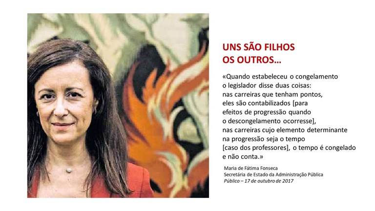 Ficou, ainda, evidente que em relação ao tempo de serviço perdido pelos professores entre agosto de 2005 e dezembro de 2007, o Governo nem quer ouvir falar. Já em relação ao tempo congelado desde 1 de janeiro de 2011, ficou claro que o Governo não o pretende considerar no momento do descongelamento, para efeitos de reposicionamento, mas também não houve qualquer proposta concreta que visasse a sua futura recuperação.