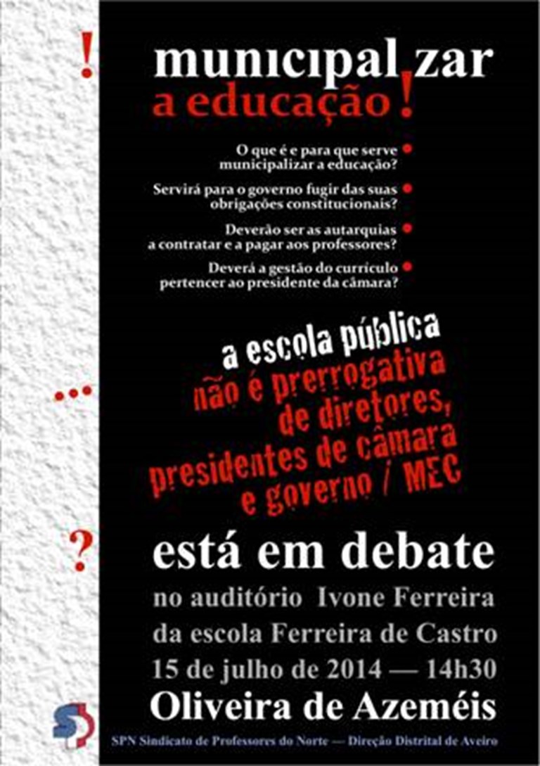 Profundamente preocupado com a possibilidade de tais municípios avançarem, ainda que a título experimental, no sentido de municipalizar Educação, o SPN pretende alertar para os resultados perversos da municipalização, experimentada noutros países, quer em termos de igualdade de oportunidades, quer no que respeita à qualidade de ensino, Assim, o SPN apela aos órgãos do Poder Local para que não aceitem embarcar neste processo sem, primeiro, avaliar seriamente os riscos, nomeadamente o da desresponsabilização do Estado central pela promoção e financiamento de uma Educação Pública de qualidade para todos.