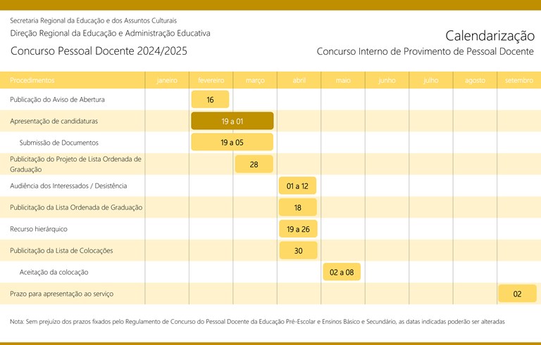 Foi publicado o Aviso de Abertura, assim como o Regulamento dos concursos interno e externo de provimento de pessoal docente da educação pré-escolar e dos ensinos básico, secundário e artístico nos quadros do sistema educativo da Região Autónoma dos Açores, para o ano de 2024/2025. O prazo para apresentação de candidatura é de dez (10) dias úteis, fixado entre o dia 19 de fevereiro (9 horas) e 1 de março (18 horas locais) e a suubmissão de documentos prolonga-se até 5 de março.