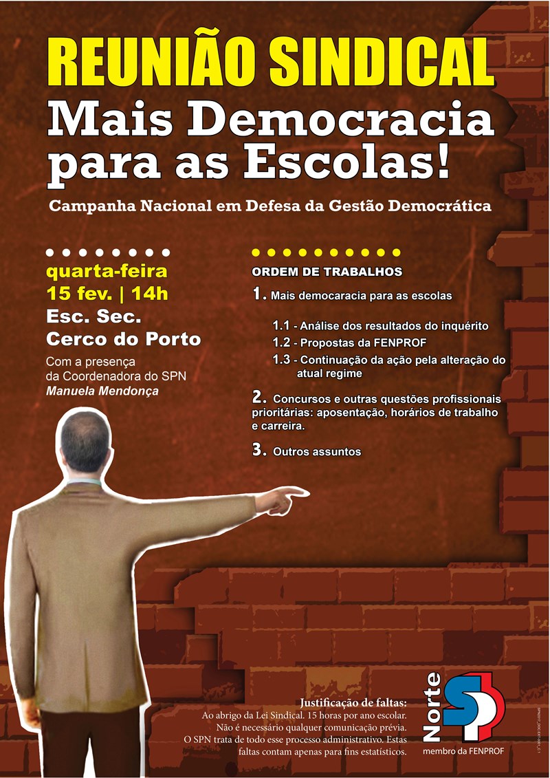 Com o objetivo de debater o atual modelo de gestão e os sentidos a dar à sua revisão, o Sindicato dos Professores do Norte (SPN) promoveu, hoje, 15 de Fevereiro, na Escola Básica e Secundária do Cerco (Porto), a primeira de muitas reuniões que se realizarão em todos os agrupamentos e escolas não agrupadas do norte do país.