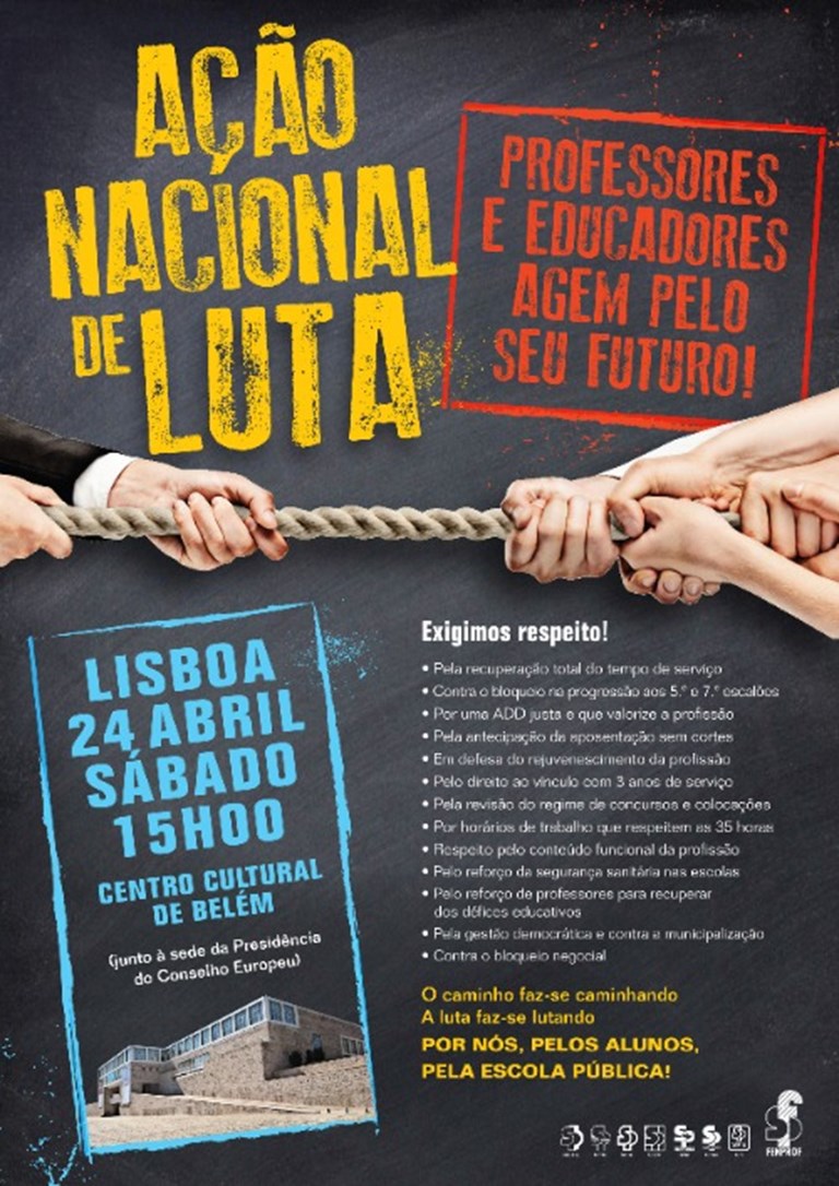 Ação Nacional de Luta Professores agem pelo seu futuro! Dia 24 de abril, 15H00, junto ao CCB - Em defesa do rejuvenescimento da profissão - Pelo direito ao vínculo com 3 anos de serviço - Pela revisão do regime de concursos e colocações - Pelo reforço de professores para recuperar dos défices educativos… Apesar de serem quase 25 000 os docentes contratados com três ou mais anos de serviço (dos quais cerca de 12 mil já exercem atividade há 10 ou mais anos) só foram abertas 2455 vagas para ingresso nos quadros (vinculação). [LER TEXTO COMPLETO] Não te desresponsabilizes!... A luta faz-se lutando. > clica para veres o cartaz INSCRIÇÕES NOS TRANSPORTES > AQUI (INSCRIÇÃO ONLINE) |