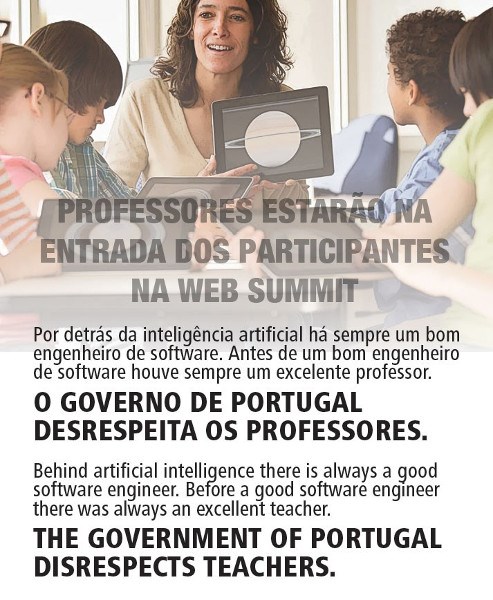 As organizações sindicais de professores estiveram na entrada da Web Summit, antes da sessão de abertura do evento, para distribuir um folheto aos participantes onde denunciam que o governo de Portugal não respeita os professores.