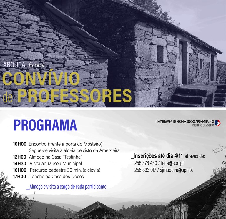 A iniciativa do Departamento dos Professores Aposentados da Direção Distrital de Aveiro (Norte) — Convívio de Professores, em Arouca — pensada inicialmente para o dia 29 de outubro foi adiada para o dia 6 de novembro. Esta é uma iniciativa aberta a todos os sócios (e não apenas aos aposentados). O almoço e a visita fica a cargo de cada participante.
