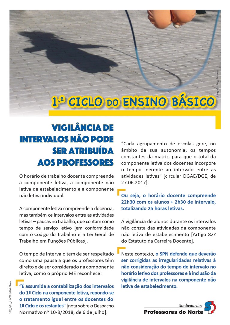 Neste contexto, o SPN defende que deverão ser corrigidas as irregularidades relativas à não consideração do tempo de intervalo no horário letivo dos professores e à inclusão da vigilância de intervalos na componente não letiva de estabelecimento.