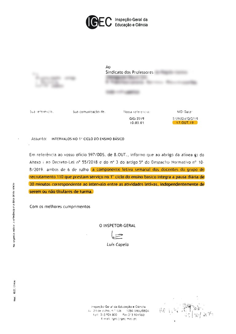 O tempo de intervalo tem de ser respeitado como uma pausa a que os professores têm direito e de ser considerado na componente letiva, como o próprio ME reconhece: