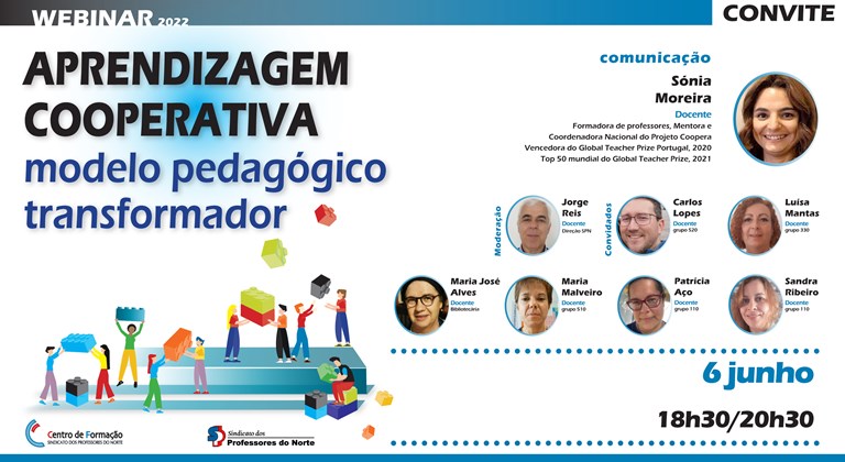 O Centro de Formação do Sindicato dos Professores do Norte (CF/SPN) disponibiliza a gravação do webinar "Aprendizagem Cooperativa: modelo pedagógico transformador", com Sónia Moreira e os convidados Carlos Lopes, Luísa Mantas, Maria José Alves, Maria Malveiro, Patrícia Aço e Sandra Ribeiro.