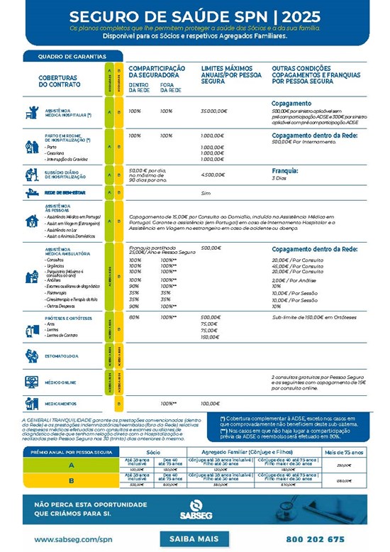 Neste sentido, serve a presente para informar sobre as atualizações dos prémios e sobre as principais vantagens e alterações introduzidas nas Condições e Planos de Garantias do Seguro de Saúde SPN para a anuidade 2021 e que entram em vigor já a 1 de janeiro de 2021, a saber: