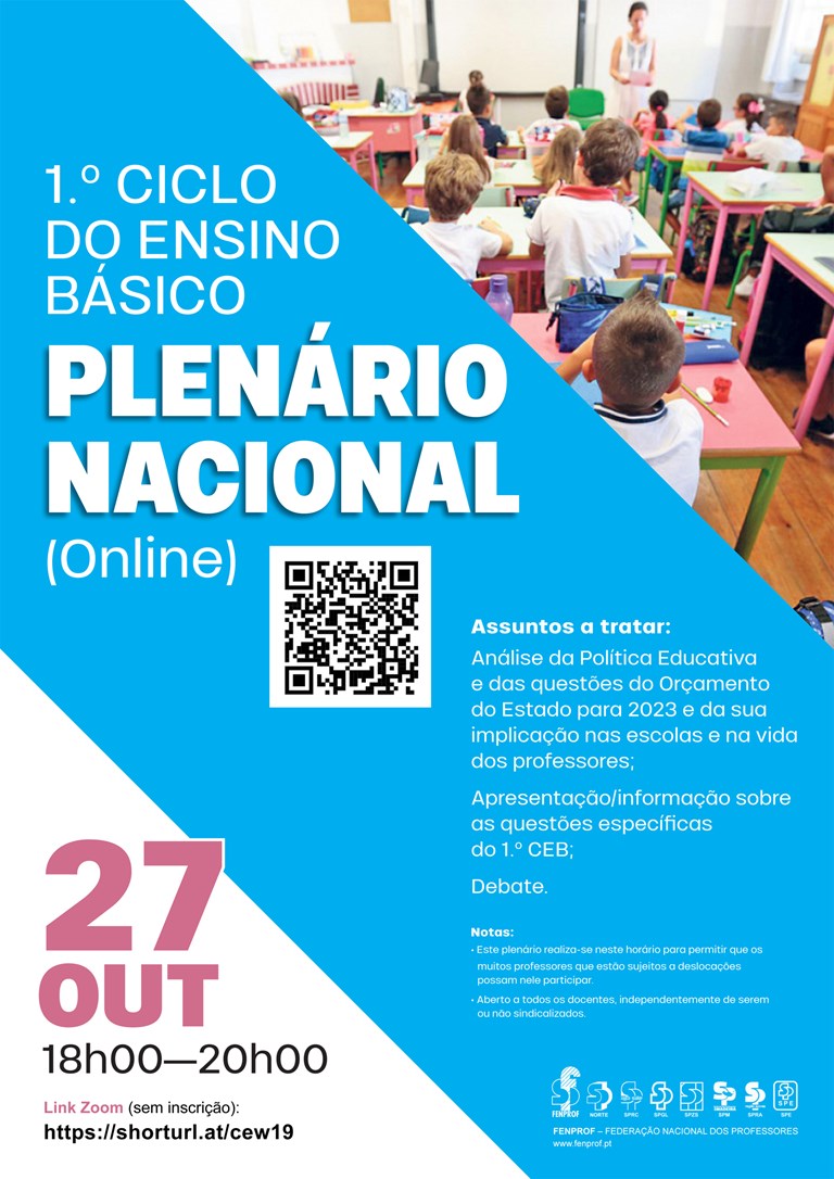 As questões específicas do 1.º Ciclo do Ensino Básico estarão naturalmente, em destaque neste plenário nacional do setor. A análise da política educativa e das questões do Orçamento de Estado para 2023 e a sua implicação nas escolas e na vida pessoal dos professores são, igualmente, temas a abordar. O plenário será aberto a todos os docentes (sindicalizados e não sindicalizados)
