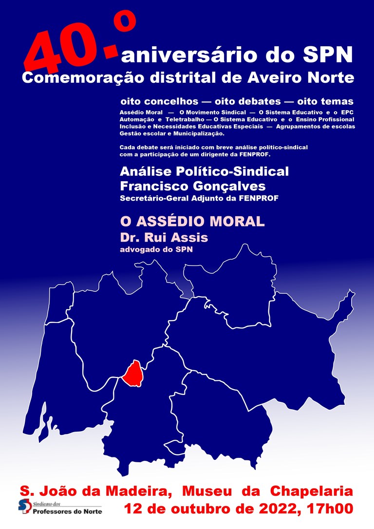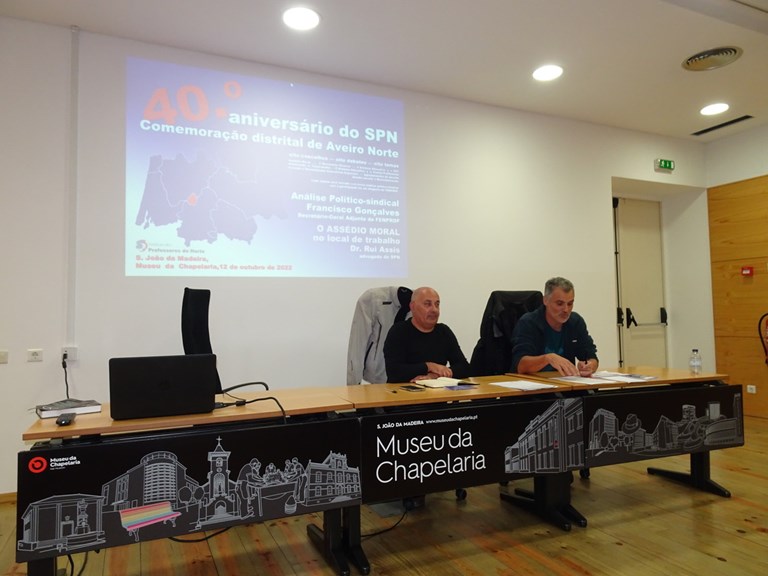 No âmbito do 40.º Aniversário do Sindicato dos Professores do Norte (SPN), a Direção Distrital de Aveiro (Norte) realizou o primeiro de oito debates temáticos — Assédio Moral no Local de Trabalho. Aconteceu no dia 12 de outubro, no Museu da Chapelaria (São João da Madeira)