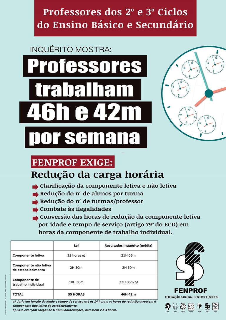 Divulgadas em conferência de imprensa realizada na manhã da passada sexta-feira, 10 de março, em Lisboa, as conclusões desse inquérito, com 5 709 respostas validadas, apontam: os professores trabalham, em média, mais de 46 horas por semana! Confirma-se, assim, um problema já conhecido mas que não tem merecido qualquer solução por parte de várias equipas ministeriais.