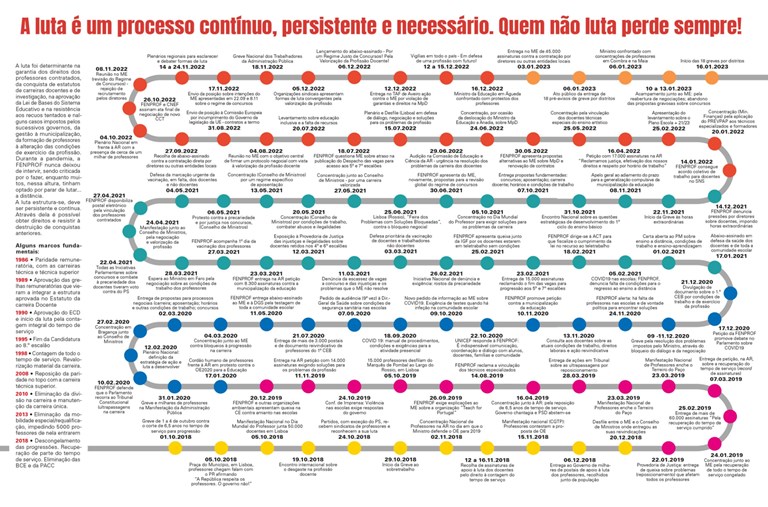 A edição n.º 311 do «Jornal da FENPROF» publica, nas páginas centrais um resumo dos principais momentos da luta dos docentes desde 1 de outubro de 2018 até ao início da greve por distritos a 16 de janeiro de 2023. Foram 63 meses e meio (5 anos, 3 meses e 16 dias) e mais de 123 iniciativas públicas em que a Fenprof nunca deixou de estar ao lado dos educadores e professores na luta pelos seus direitos.